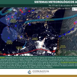 Hoy, un canal de baja presión sobre el occidente de México y el ingreso de humedad de ambos océanos generarán lluvias fuertes (de 25 a 50 milímetros [mm]) en Chiapas, Oaxaca, Quintana Roo, Tabasco y Veracruz; chubascos (de 5 a 25 mm) en Campeche, Guerrero, Jalisco, Michoacán, Nayarit, Puebla yYucatán, y lluvias aisladas (de 0.1 a 5 mm) en Hidalgo, San Luis Potosí, Sinaloa y Tamaulipas.