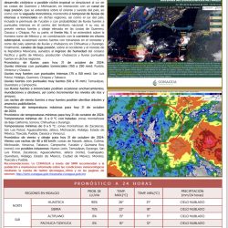 Hoy, canales de baja presión sobre el noreste, oriente, occidente y sureste de México, el ingreso de humedad de ambos océanos, una zona de baja presión con 90 % de probabilidad para desarrollar un ciclón tropical en 48 horas y el frente frío número 5 en el norte del país ocasionarán lluvias torrenciales (de 150 a 250 milímetros [mm]) en Oaxaca, Puebla y Veracruz; intensas (de 50 a 75 mm) en Chiapas, Guerrero, Hidalgo, San Luis Potosí y Tabasco; muy fuertes (de 50 a 75 mm) en Campeche, Querétaro y Tamaulipas; fuertes (de 25 a 50 mm) en Colima, Guanajuato, Jalisco, Michoacán y Quintana Roo; chubascos (de 5 a 25 mm) en Aguascalientes, Ciudad de México, Coahuila, Durango, Estado de México, Morelos, Nayarit, Nuevo León, Tlaxcala, Yucatán y Zacatecas, y lluvias aisladas (de 0.1 a 5 mm) en Chihuahua.