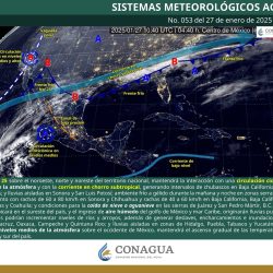 Para hoy, el frente frío No. 25 se extenderá sobre el noroeste, norte y noreste del territorio nacional y mantendrá la interacción con una circulación ciclónica en niveles medios y altos de la atmósfera y con la corriente en chorro subtropical, generando intervalos de chubascos en Baja California, Coahuila, Nuevo León y Tamaulipas; y lluvias aisladas en Sonora y San Luis Potosí; ambiente frío a gélido durante la mañana y noche en zonas serranas del noroeste y norte del país; así como viento con rachas de 60 a 80 km/h en Sonora y Chihuahua, y rachas de 40 a 60 km/h en Baja California, Baja California Sur, Sinaloa, Durango, Zacatecas y Coahuila; además de mantenerse las condiciones para la caída de nieve o aguanieve en las sierras de Juárez y San Pedro Mártir, B.C. Por su parte, un canal de baja presión que se ubicará en el sureste del país, y el ingreso de aire húmedo del golfo de México y mar Caribe, originarán lluvias puntuales fuertes en Chiapas, las cuales podrían incrementar niveles de ríos y arroyos, además de generar deslaves, encharcamientos e inundaciones; intervalos de chubascos en Veracruz, Oaxaca, Campeche y Quintana Roo; y lluvias aisladas en zonas de Hidalgo, Puebla, Tabasco y Yucatán. Finalmente, una circulación anticiclónica en niveles medios de la atmósfera sobre el occidente de México, mantendrá el ascenso gradual de las temperaturas diurnas en el occidente, centro y sur del país.