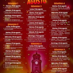 Entre las fechas, destaca el miércoles 6 de agosto con la jornada “Jóvenes de Corazón”, que contempla acciones de voluntariado en hospitales, promoviendo una participación con sentido humano.