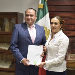 En representación del presidente de la Junta de Gobierno, diputado Andrés Velázquez Vázquez, el director de la Coordinación de Asesores, Eduardo López Palma, y el director del Instituto de Estudios Legislativos, Alan Mijail Hernández Segovia, recibieron de Ana Karen Parra Bonilla, titular de la Comisión de Derechos Humanos del Estado de Hidalgo, su tercer informe anual de actividades.